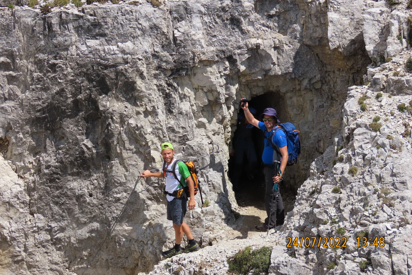Po rahlem šoku se odločimo za plan “B”, ki ga pravzaprav sploh nismo imeli in smo si ga na hitro naredili … nov cilj je bila bližnja gora Monte Piana 2.324 m, o kateri pravzaprav nismo vedeli nič in od nje tudi nič posebnega pričakovali, kar smo pa doživeli in videli, pa nas je močno prijetno presenetilo. Avte pustimo nekoliko nižje in se po brezpotju gozdov usmerimo na staro opuščeno cesto na vrh, ki je že za časa I. svetovne vojne služila za oskrbovanje obrambnih linij na vrhu, če ne že prej in je spričo podorov in plazov zaprta za vozila, še vedno pa je atrakcija na vzponu na vrh in bi jo bilo škoda izpustiti. Iz Misurine je na vrh do koče Monte Piana – A. Bosi organiziran tudi prevoz s terenci. Od avta do koče smo potrebovali uro in 45 minut. Zatem sledimo zgodovinski poti Monte Piana, kjer je ogromno zgodovinskih sledov ostankov bojev v I. svetovni vojni, kar je prava paša za oči tako za nas “ta velike, kot za one ta male”. Za ogled zgodovine smo potrebovali dve uri ni pol, pa bi jih vsaj še dobro uro, če nas ne bi preganjal čas.