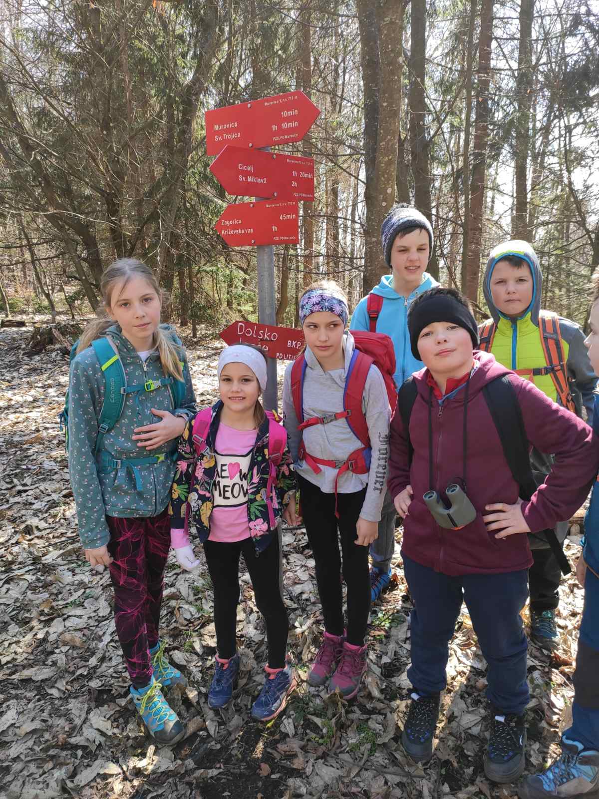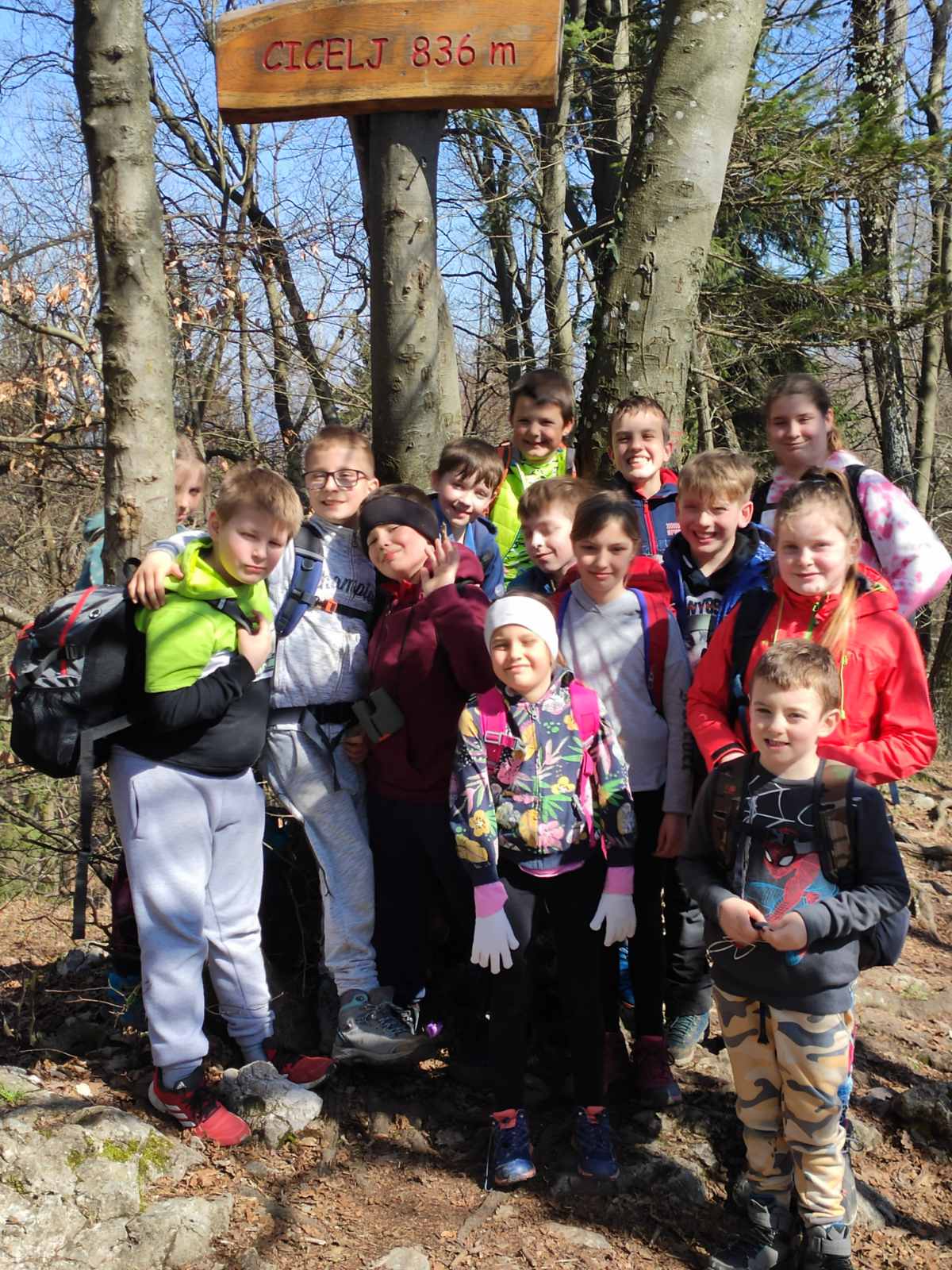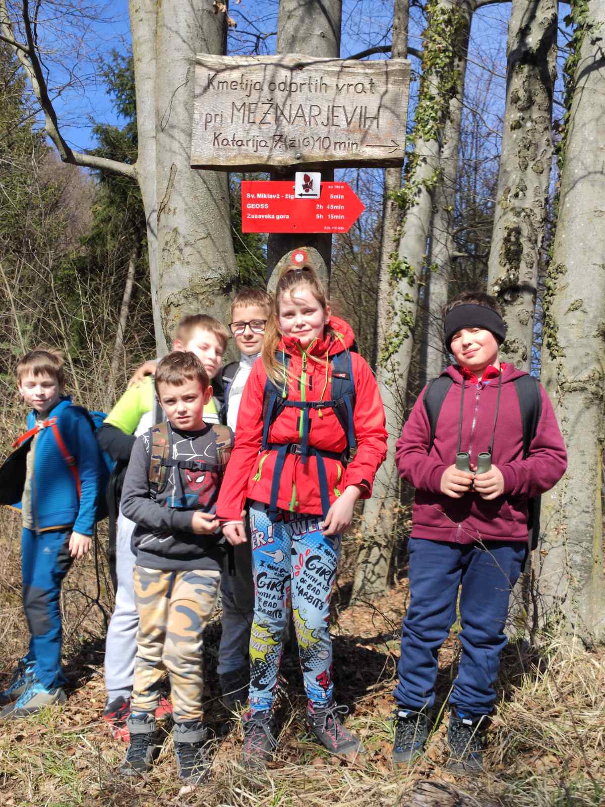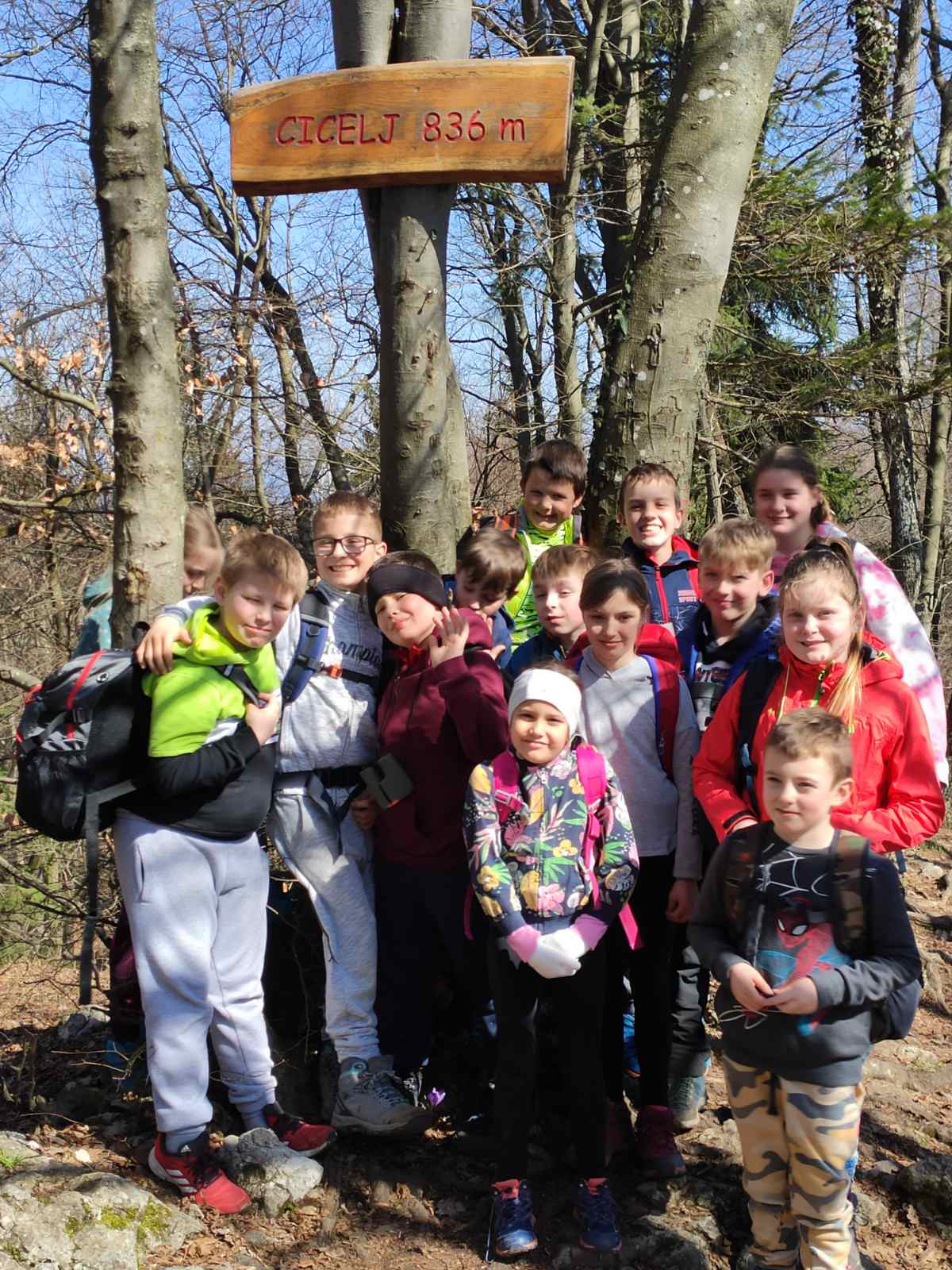 Nato se je pot začela strmo vzpenjati in nas pripeljala do vrha Cicelj, kjer smo imeli daljši postanek. Okrepčali smo se z malico iz nahrbtnika, se igrali in odtisnili žig v dnevnik žigov DPS. Gozdna pot se je začela spuščati in nas pripeljala do vasi Katarija, kjer smo se povzpeli do cerkvice svetega Miklavža. Tu smo imeli krajši postanek za okrepčilo.