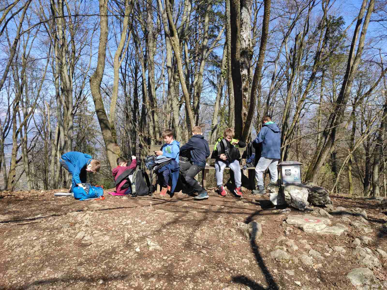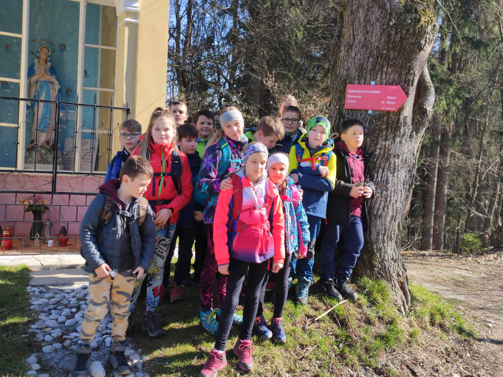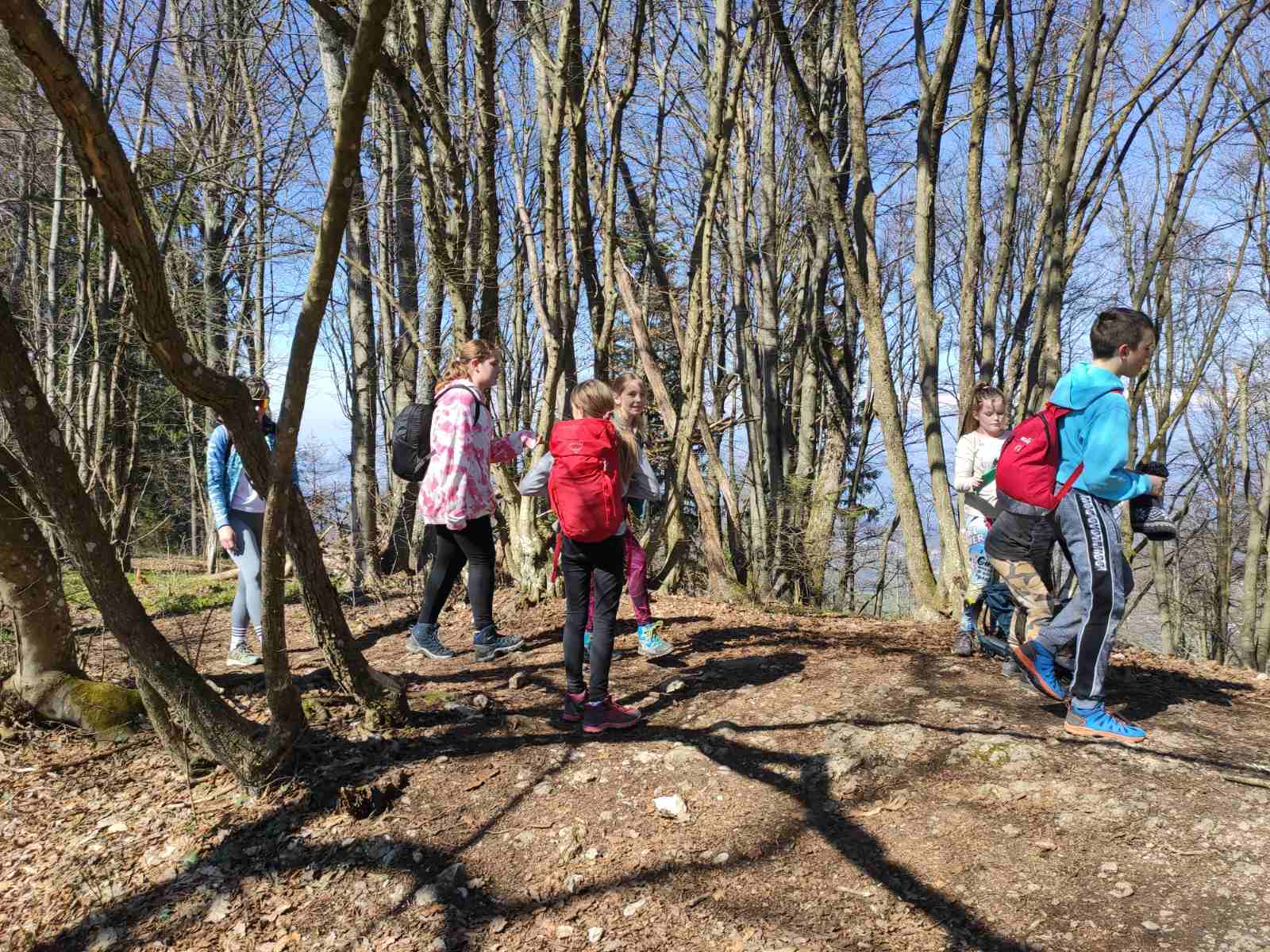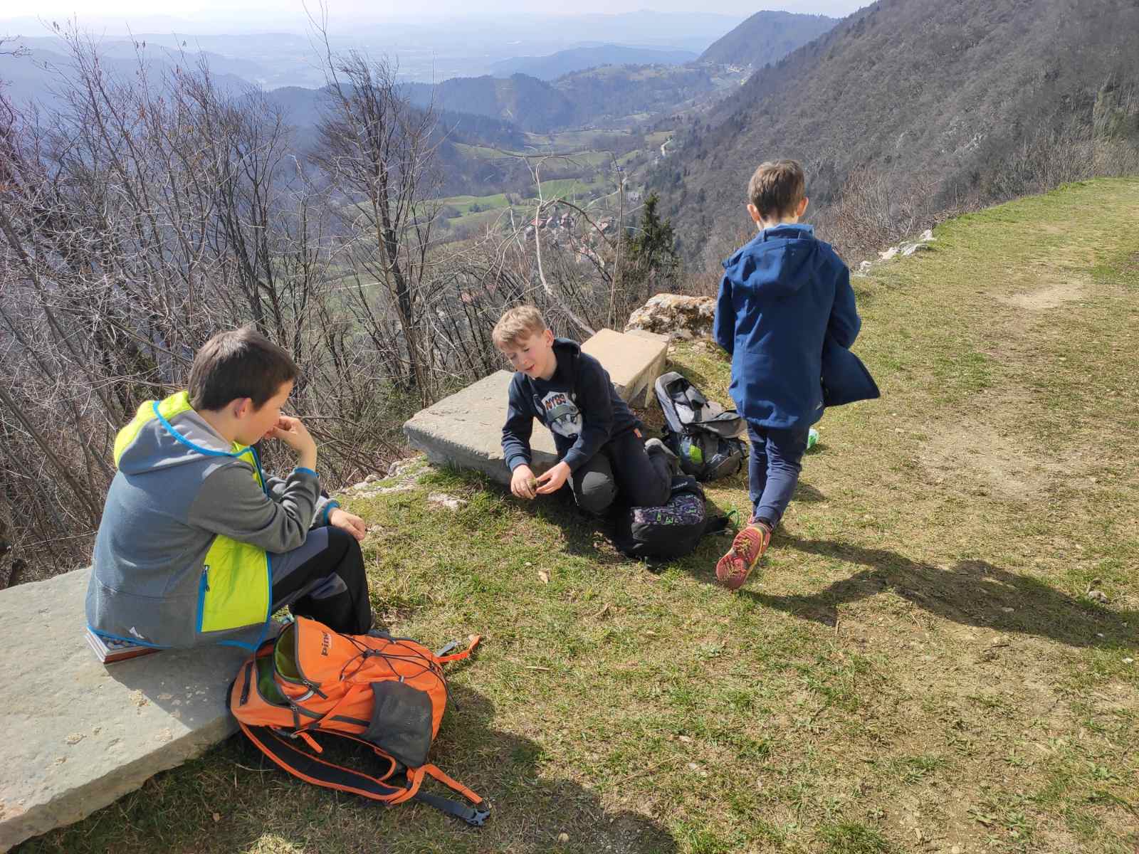 Nato se je pot začela strmo vzpenjati in nas pripeljala do vrha Cicelj, kjer smo imeli daljši postanek. Okrepčali smo se z malico iz nahrbtnika, se igrali in odtisnili žig v dnevnik žigov DPS. Gozdna pot se je začela spuščati in nas pripeljala do vasi Katarija, kjer smo se povzpeli do cerkvice svetega Miklavža. Tu smo imeli krajši postanek za okrepčilo.