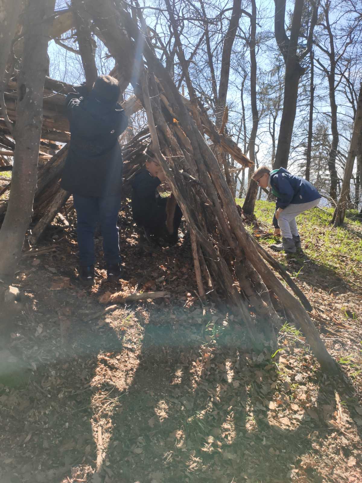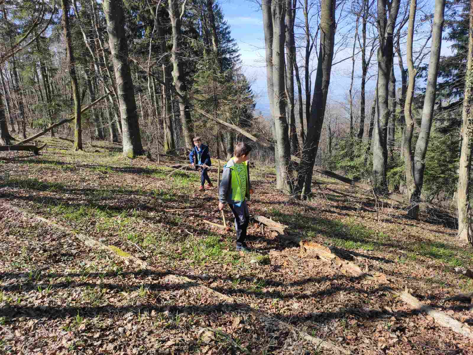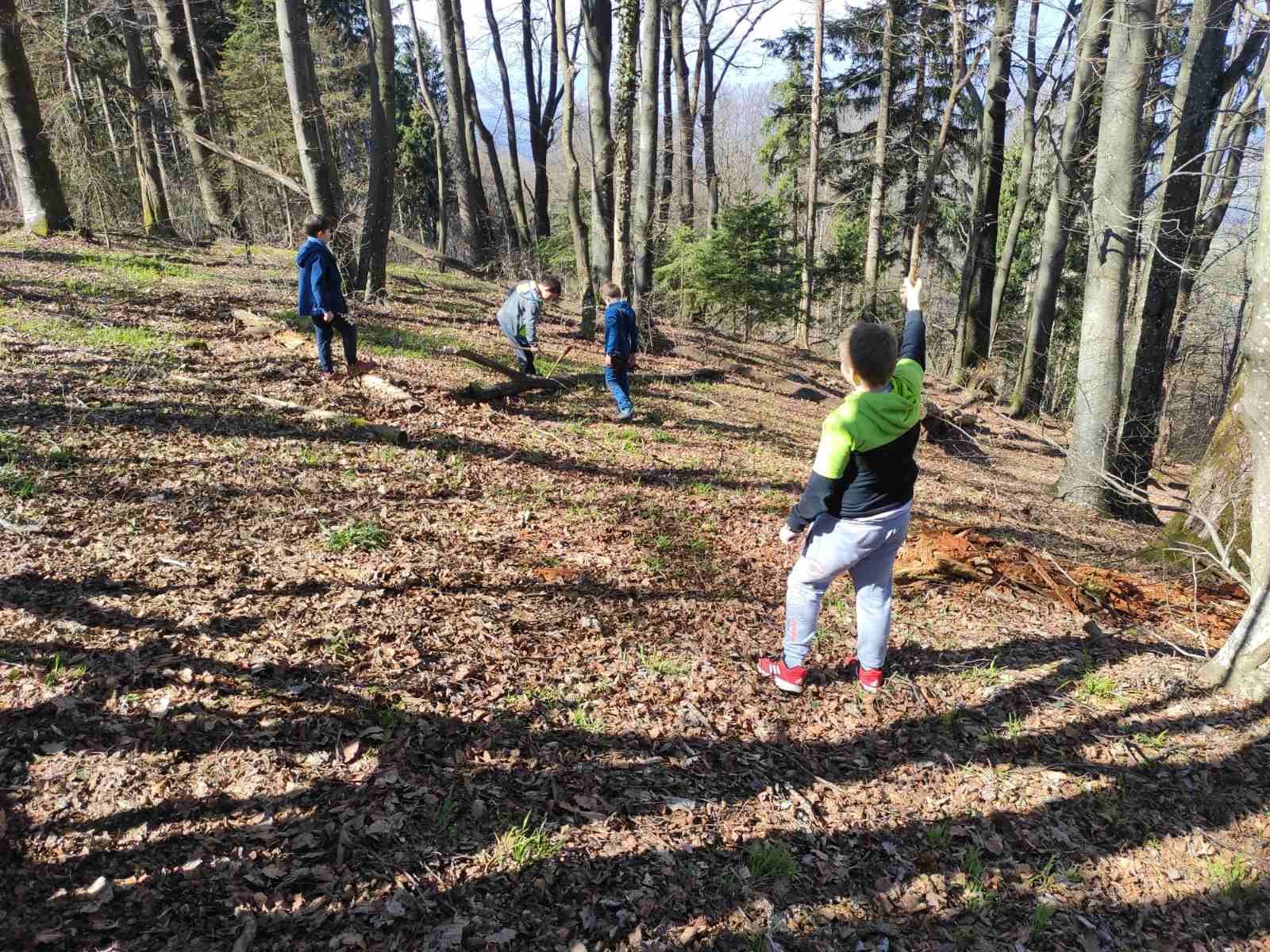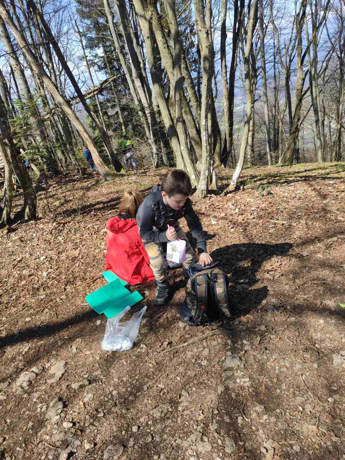 Nato se je pot začela strmo vzpenjati in nas pripeljala do vrha Cicelj, kjer smo imeli daljši postanek. Okrepčali smo se z malico iz nahrbtnika, se igrali in odtisnili žig v dnevnik žigov DPS. Gozdna pot se je začela spuščati in nas pripeljala do vasi Katarija, kjer smo se povzpeli do cerkvice svetega Miklavža. Tu smo imeli krajši postanek za okrepčilo.