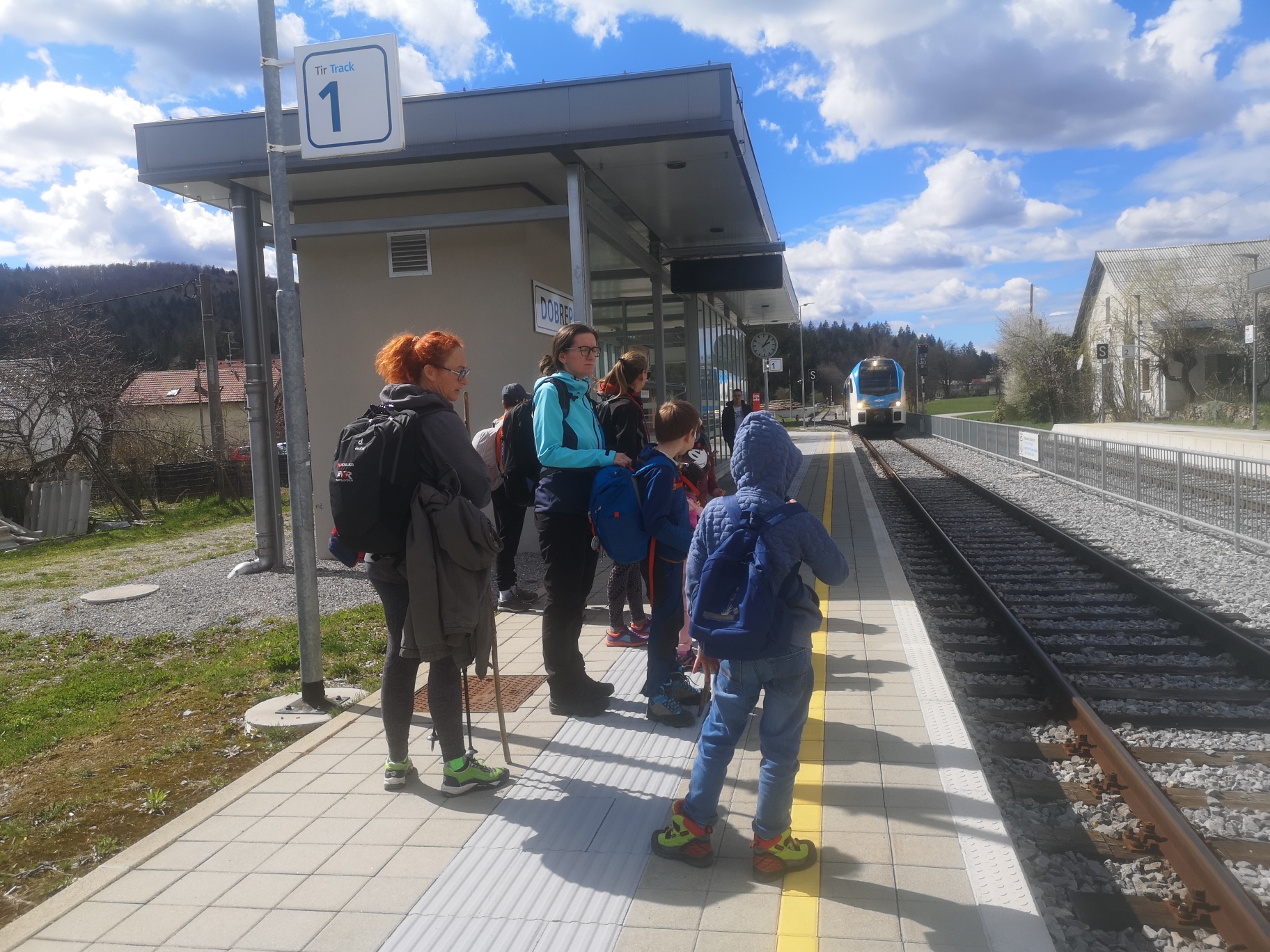 Za povratek v dolino oz. do železniške postaje smo se po priporočilu lokalnega društvenega poznavalca odločili za postajo v Dobrepolju in ne nazaj v Velikih Laščah. Predvsem, ker je bila pot krajša in smo imeli s tem več časa pri koči na vrhu, in da nismo bili v skrbeh za pravočasen prihod na postajo. Nižji del poti je sicer potekal po makadamski cesti, a nam je šlo dobro in vsi zadovoljni smo do postaje prišli 20 minut pred prihodom vlaka. Ni nam bilo težko izkoristiti ta čas.
