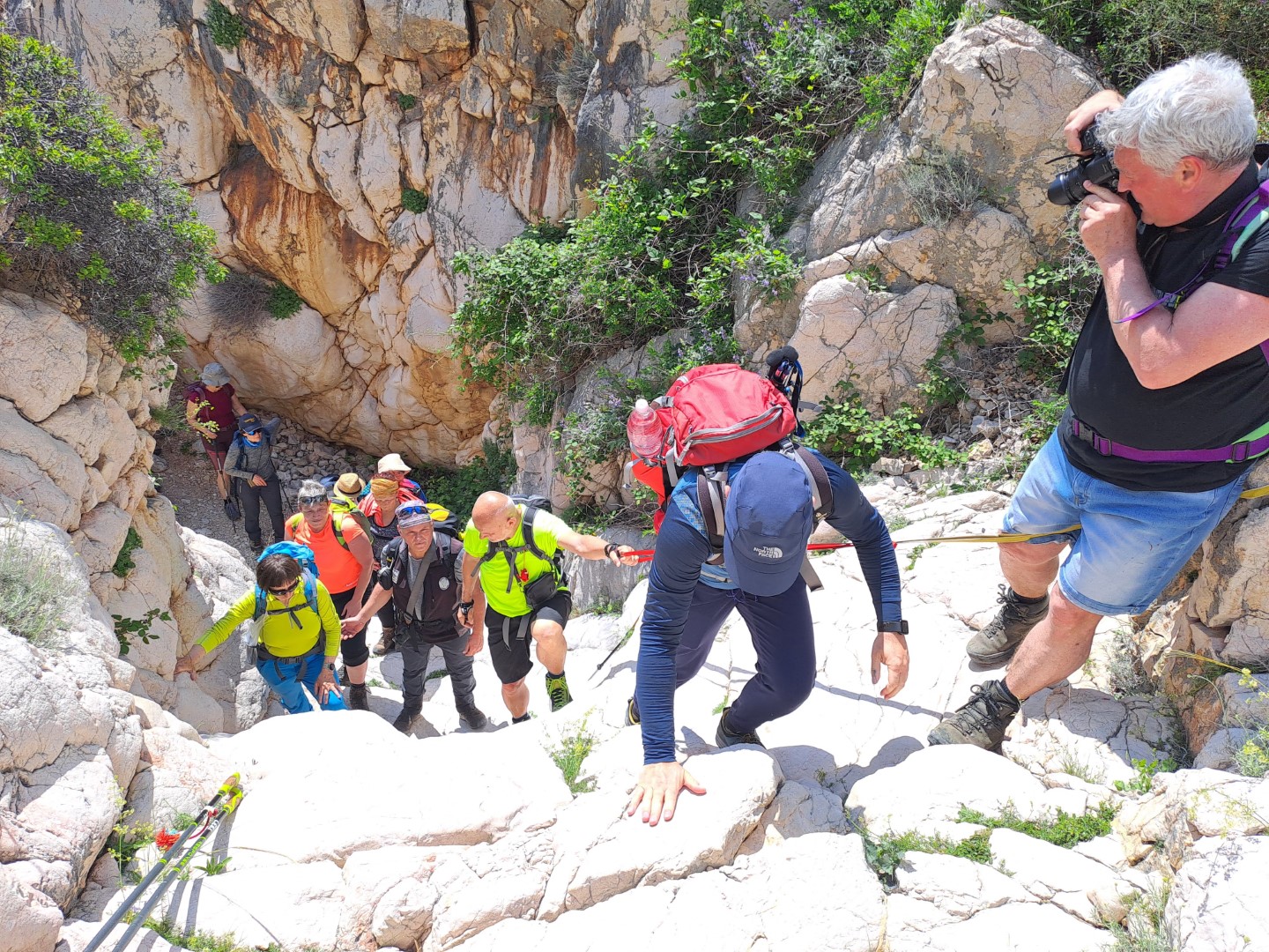 Kaj kmalu smo se vsi znašli v kanjonu Vrženica. Kanjon je na posameznih mestih dokaj ozek, zato smo napredovali v skupnem tempu. Z vzajemno pomočjo in sodelovanjem smo premagali kar nekaj kamnitih skokov in tukaj se je pokazala prednost hoje v skupini. Ob izhodu iz kanjona se je bilo potrebno povzpeti še na nasprotni breg, vse do razgledišča na Velo luko, kjer je bil naš prvotno določen cilj.