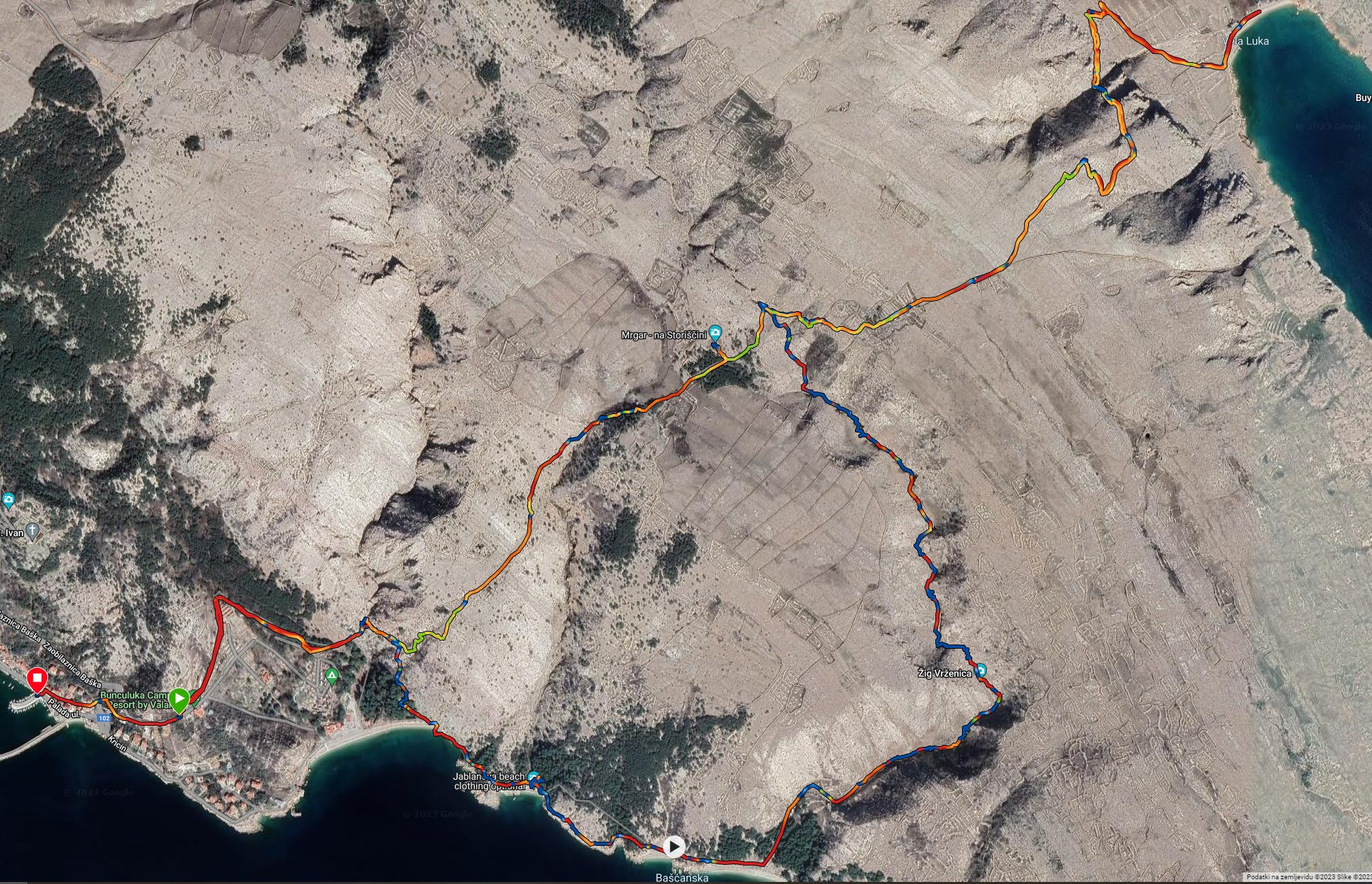 Daleč pod nami je bila prekrasna plaža, ki nas je vabila, vendar smo se zavedali, da je potrebno za povratek ponovno premagati vse višinske metre. Zato smo se razdelili v dve skupini. Prva, ki se je odločila nadaljevati do morja in druga, ki se je obrnila in šla podrobneje raziskovati mrgare, okrogle kamnite ograde za ovce, posebnih oblik in namembnosti, značilnih samo za pastirje v okolici Baške.