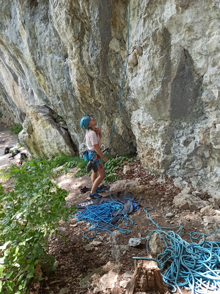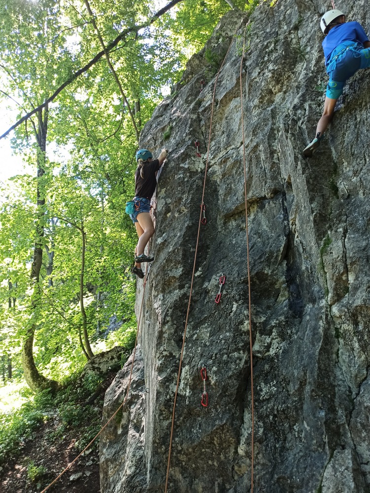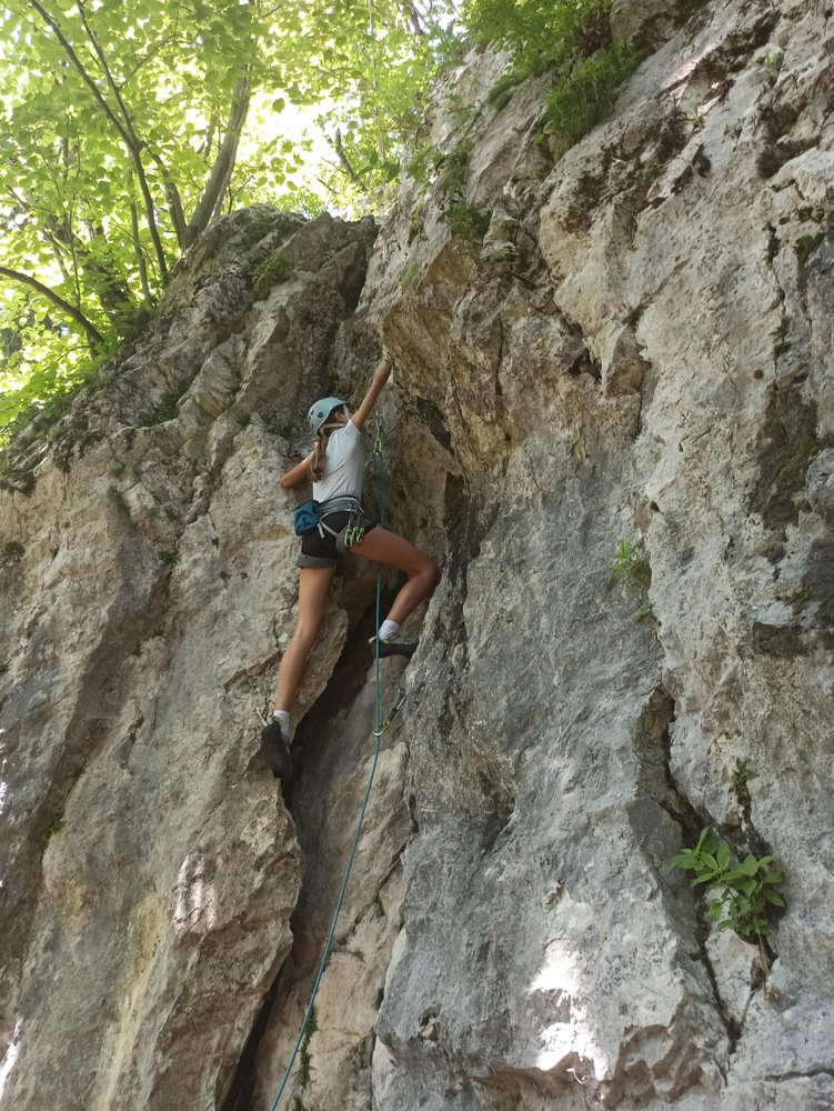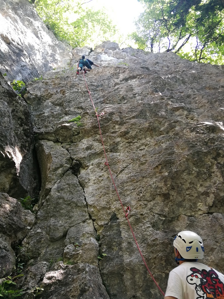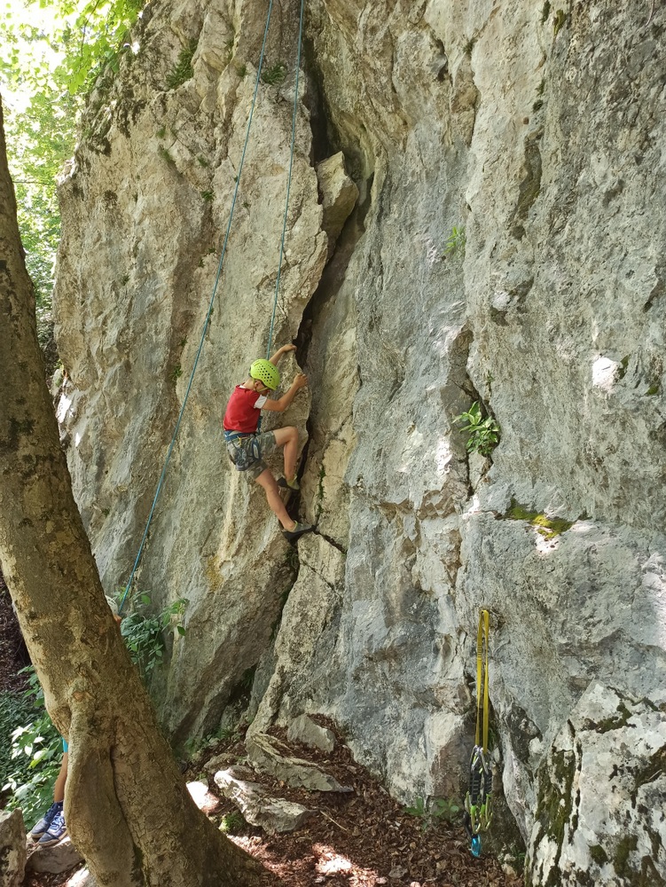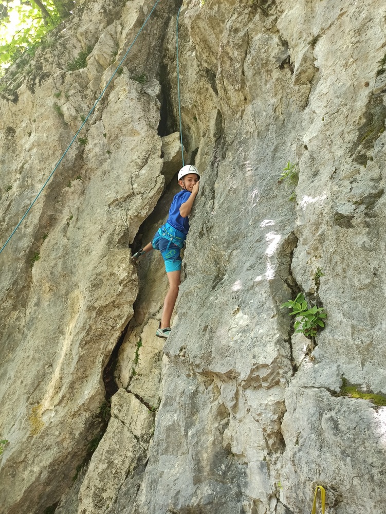V nedeljo smo plezali v sektorju V ritmu, kjer so nekoliko težje smeri, zato je bilo potrebnega tudi nekaj študiranja in več poskusov za uspešno preplezane smeri. Lovro je preplezal svojo najtežjo smer – z oceno 7a+, bravo Lovro! Tudi ostali so pokazali ogromno truda in vztrajnosti ter v svoje zbirke preplezanih smeri nabrali kar nekaj lepih ocen. Na poti iz plezališča nas je ujel dež, pa ne samo dež, ampak konkreten naliv. Tako smo tabor zaključili z nepričakovano dogodivščino, ki si jo bomo zagotovo zapomnili.
