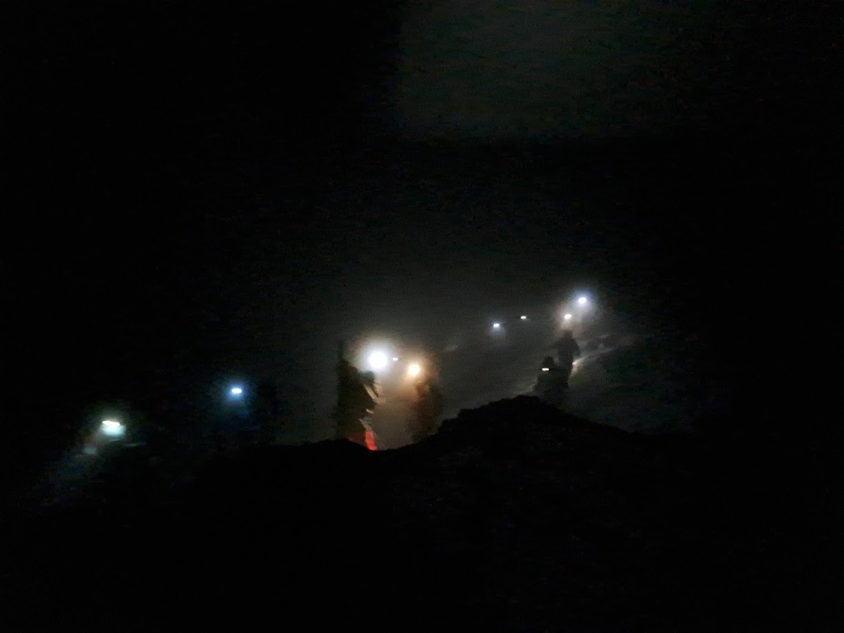 Snega je bilo malo, temperatura pa se je višala z metri vzpona. Na Sončni griči smo že trčili v meglo, le ta se je gostila in s prihodom noči je bila vidljivost na metru ali dveh. Korak za korakom smo vendarle prišli do Domžalskega doma, žal pa smo se morali odpovedati nočnemu sprehodu ob polni luni.