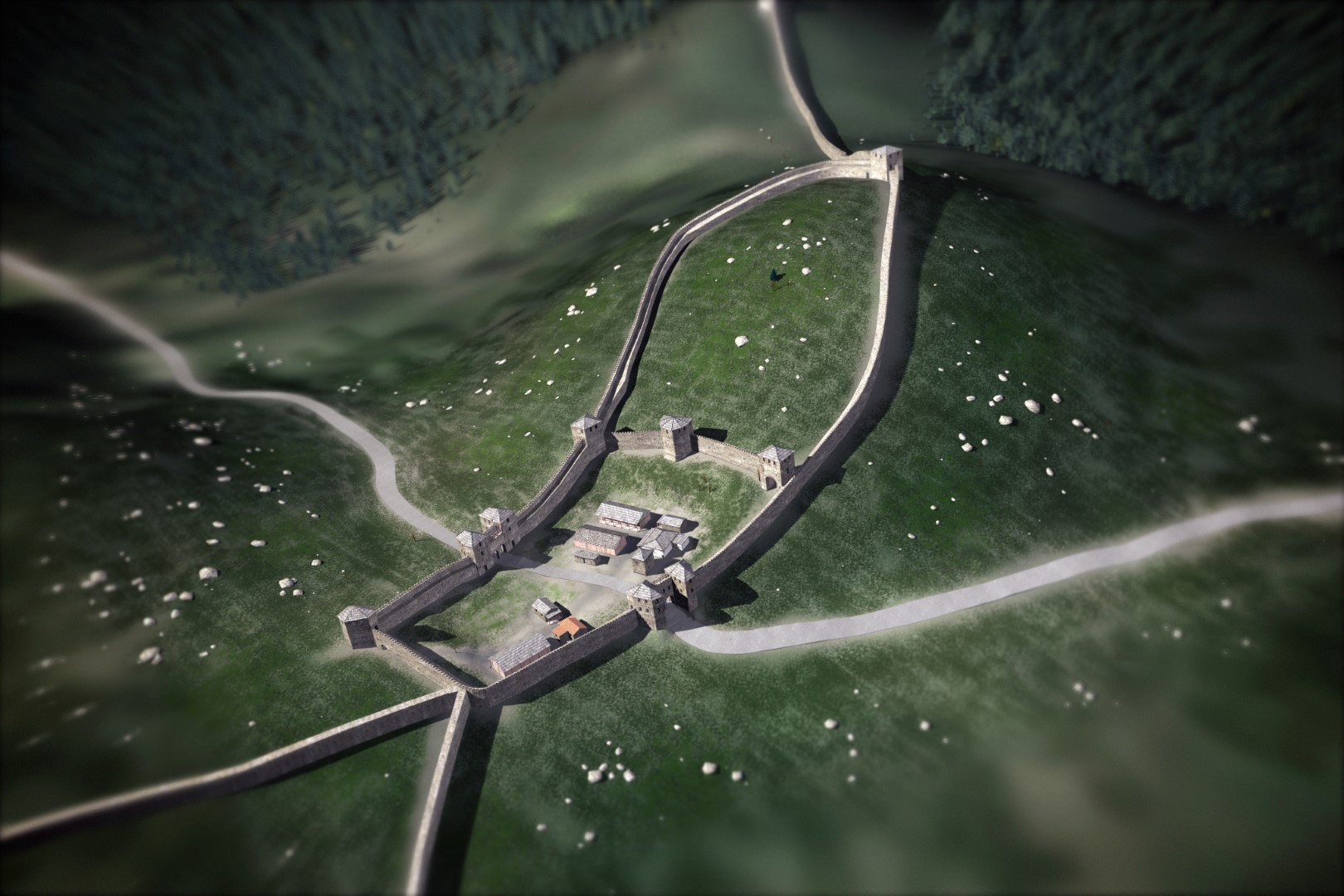 Poskus digitalne rekonstrukcije trdnjave Ad Pirum (poskus rekonstrukcije: P. Kos, Narodni muzej Slovenije; grafika: I. Dolinar)