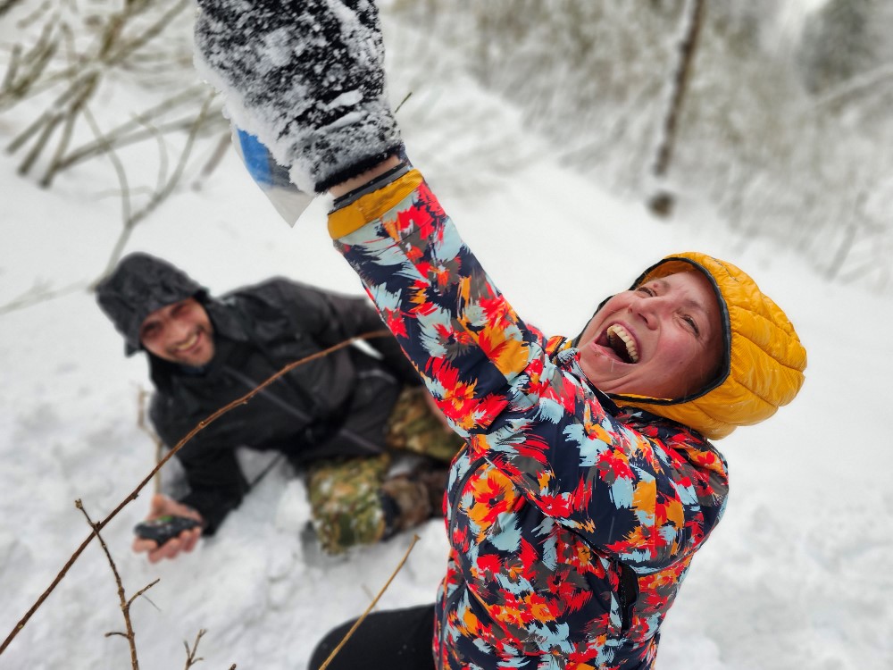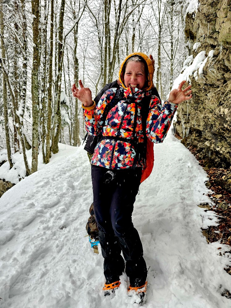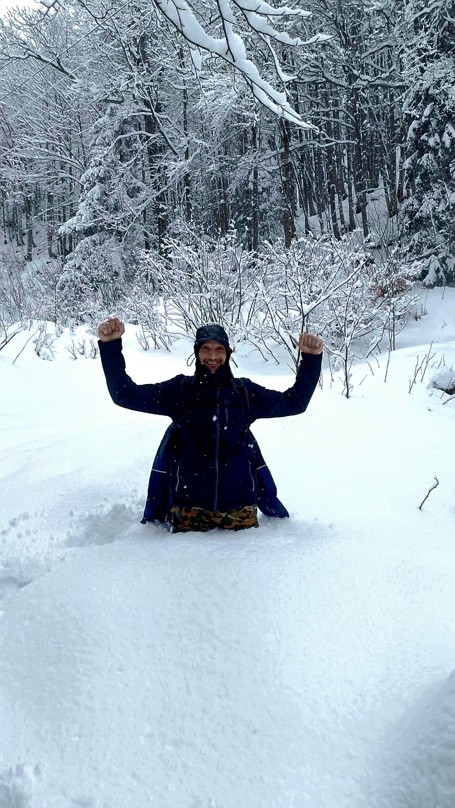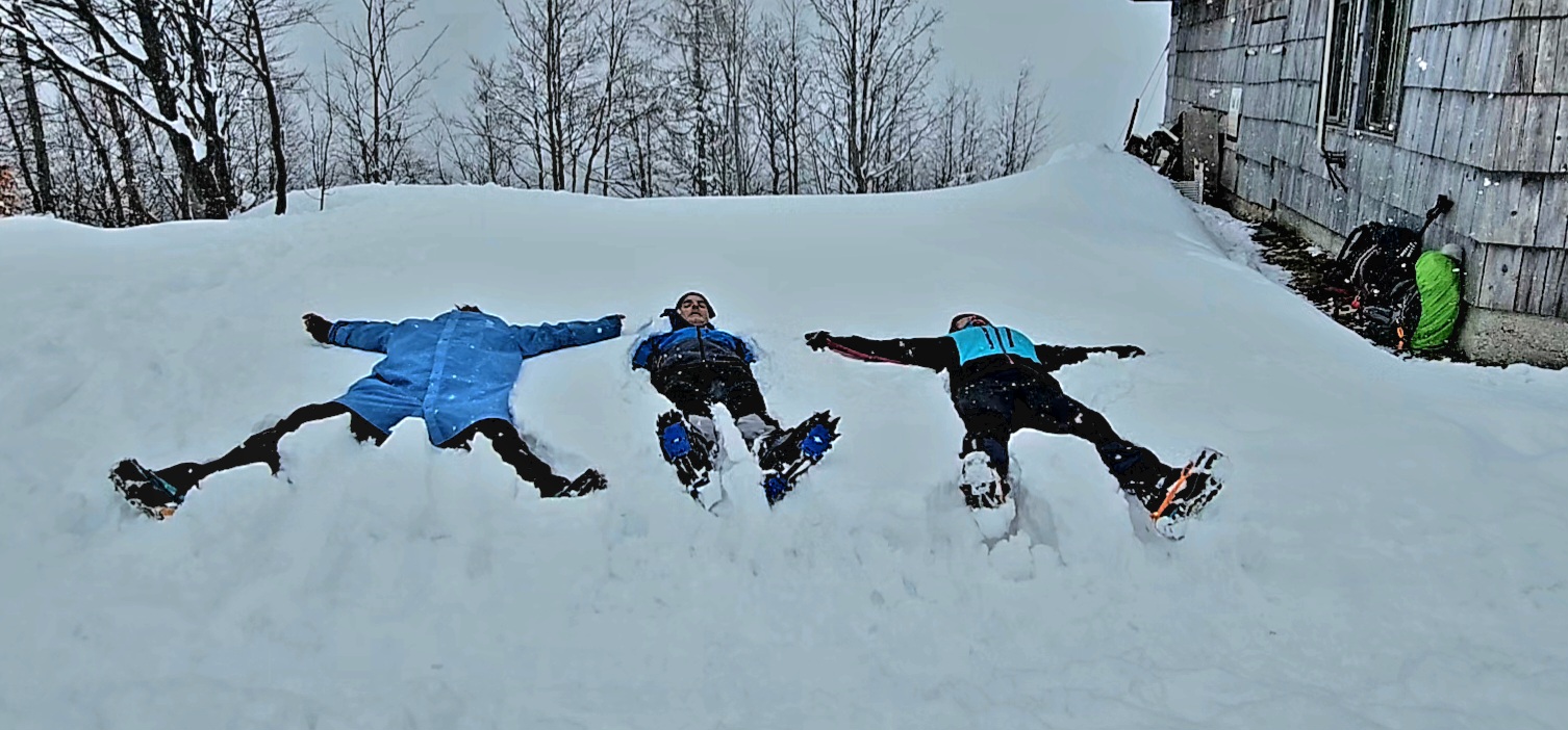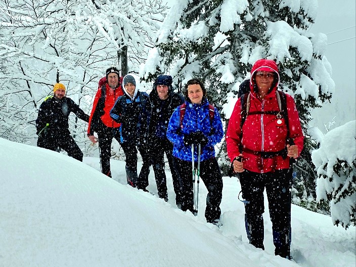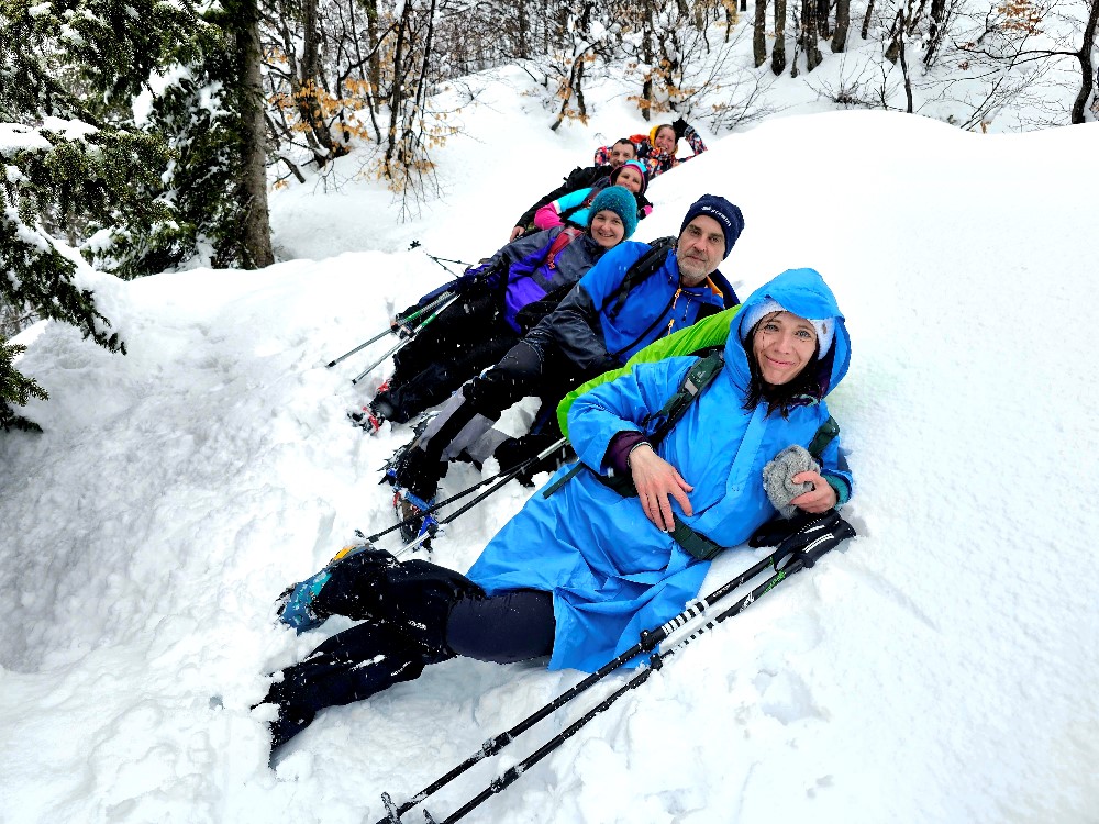 Na Domu v Komni se okrepčamo in počijemo. Glede na to, da v dolini letos ni bilo prave zime, se tukaj predamo zimskim radostim. Snežak, dričanje po riti, kepanje, poležavanje v snegu, ciljanje vej….ja lepo je vzbuditi otroka v sebi. Prav lepo smo se razigrali in res smo uživali ob spremstvu snežink.