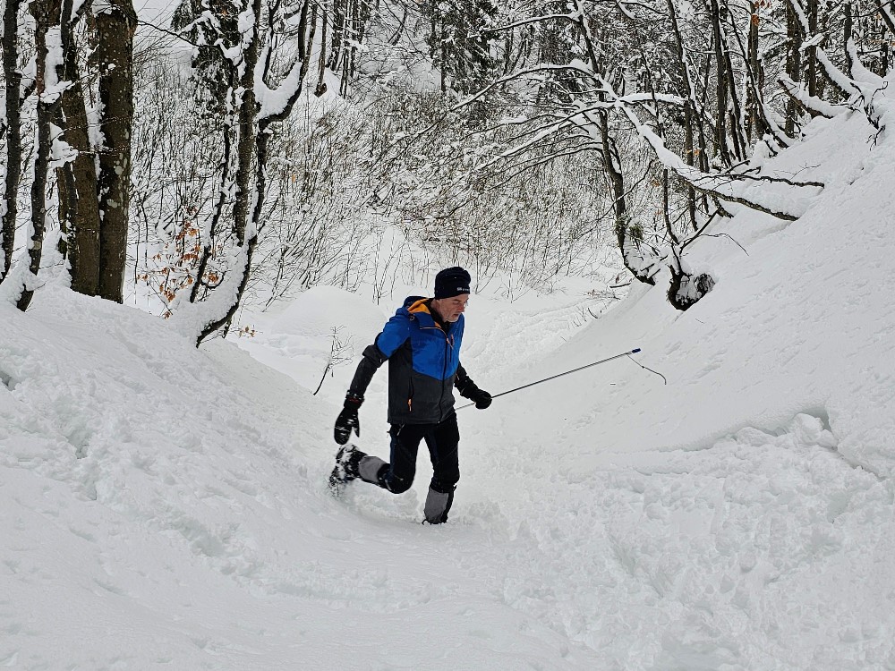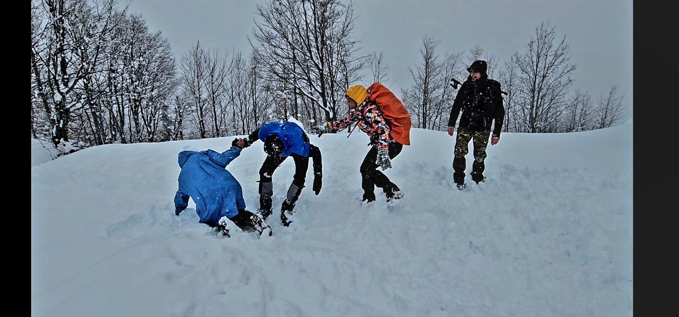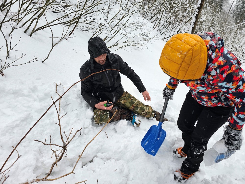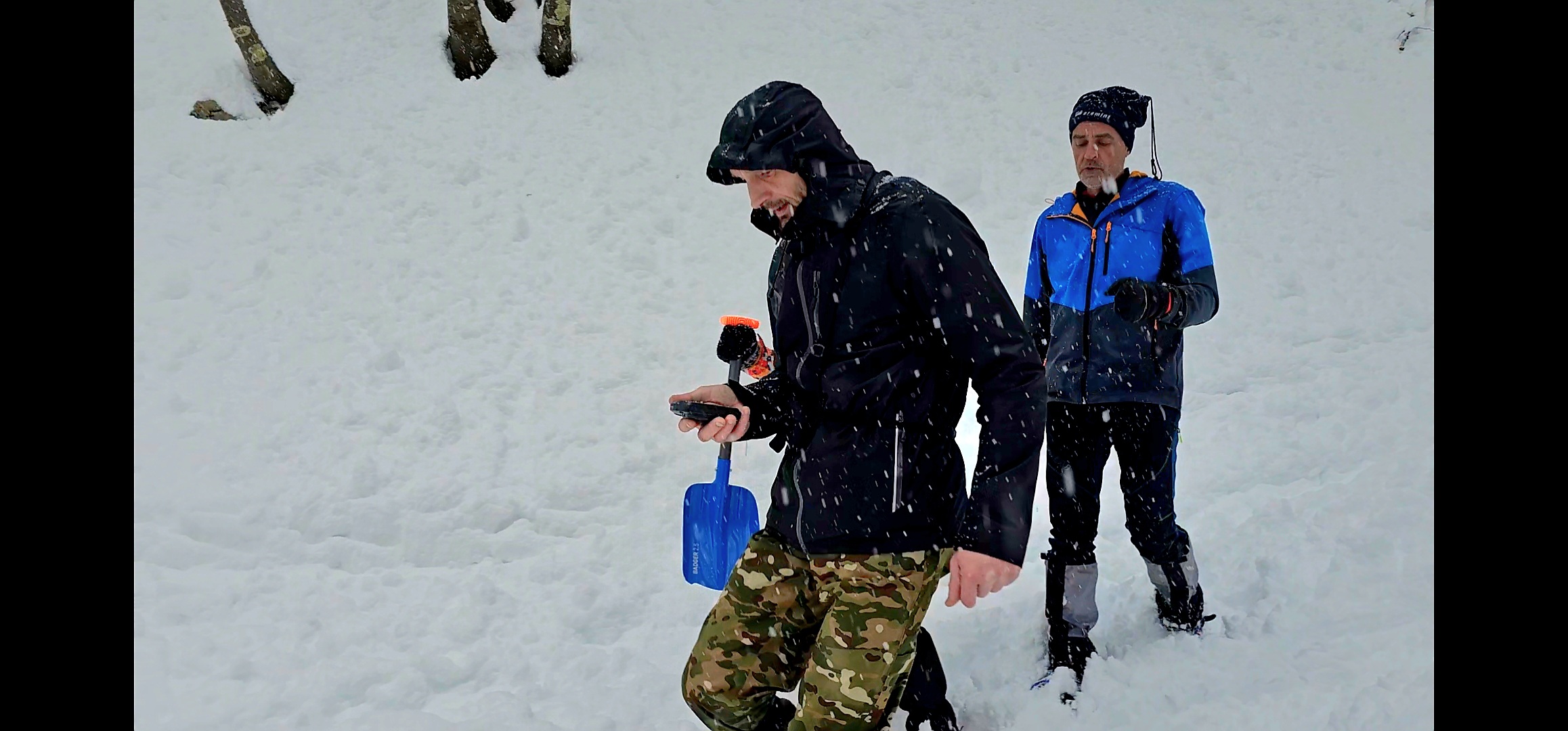 Počasi se odpravimo po isti poti nazaj do našega izhodišča. Pri 48 serpentini se z Robijam odločiva, da udeležencem pokaževa uporabo žolne v primeru plazov. Udeleženci so tako lahko sami tudi opremo uporabili in iskali tako imenovanega Marjana – našli so ga!