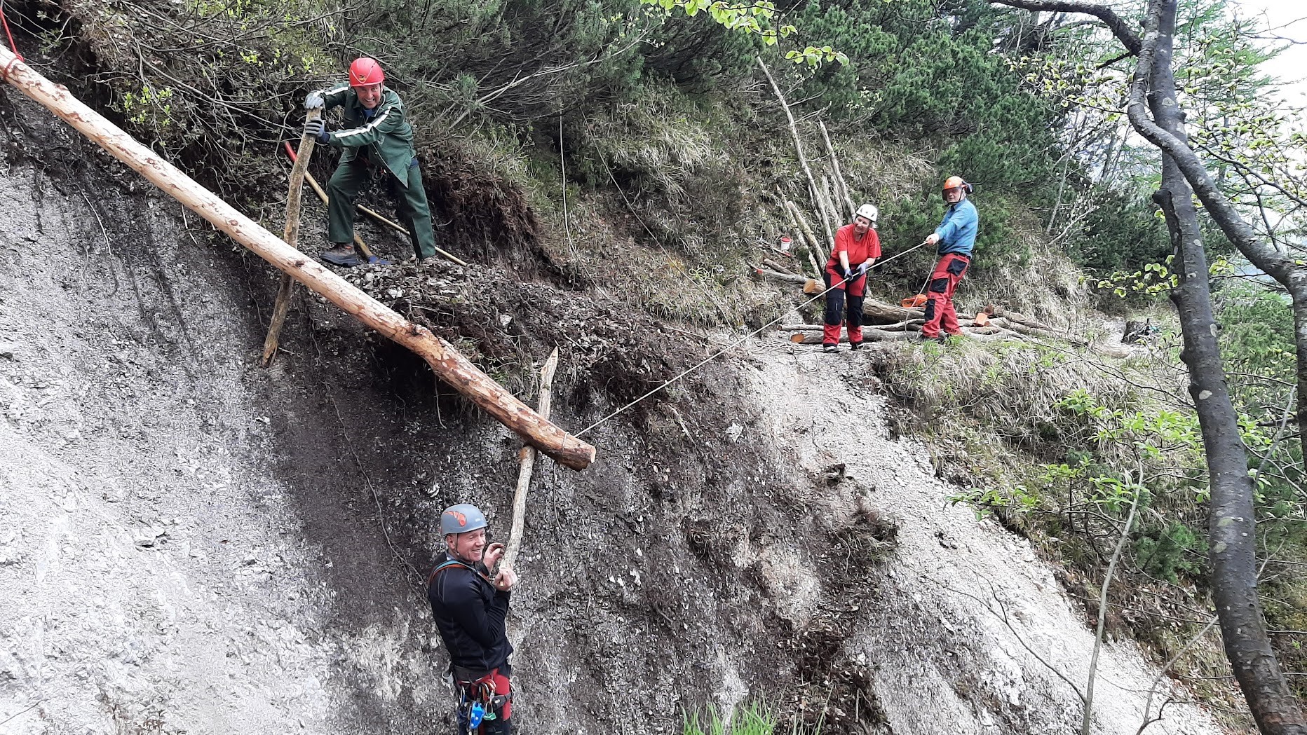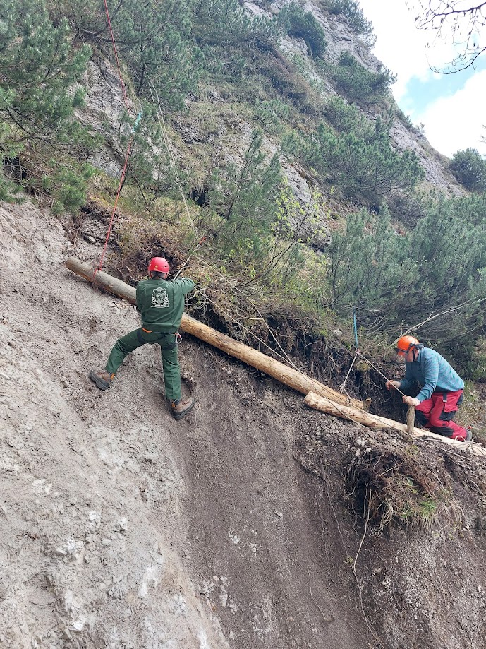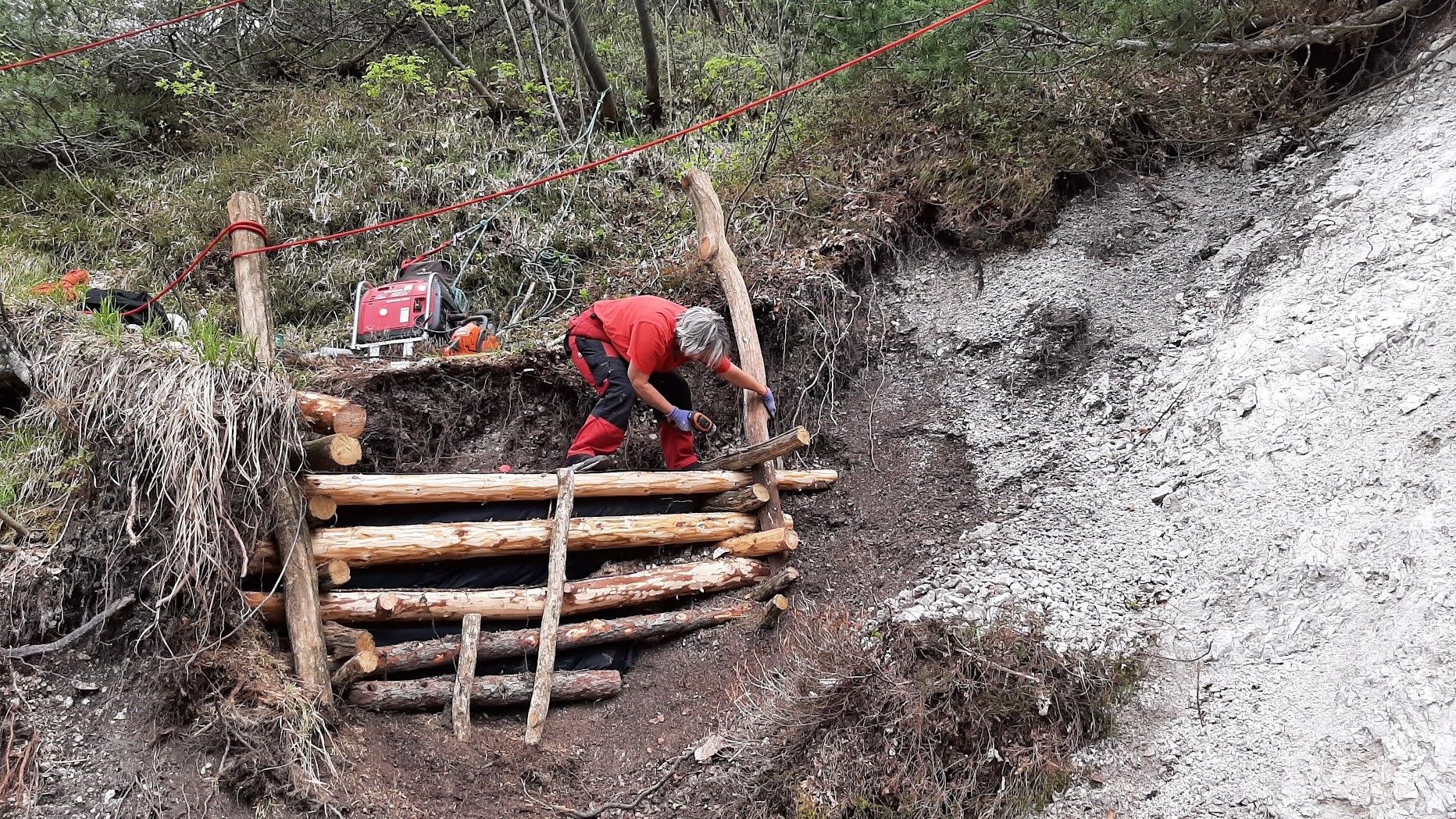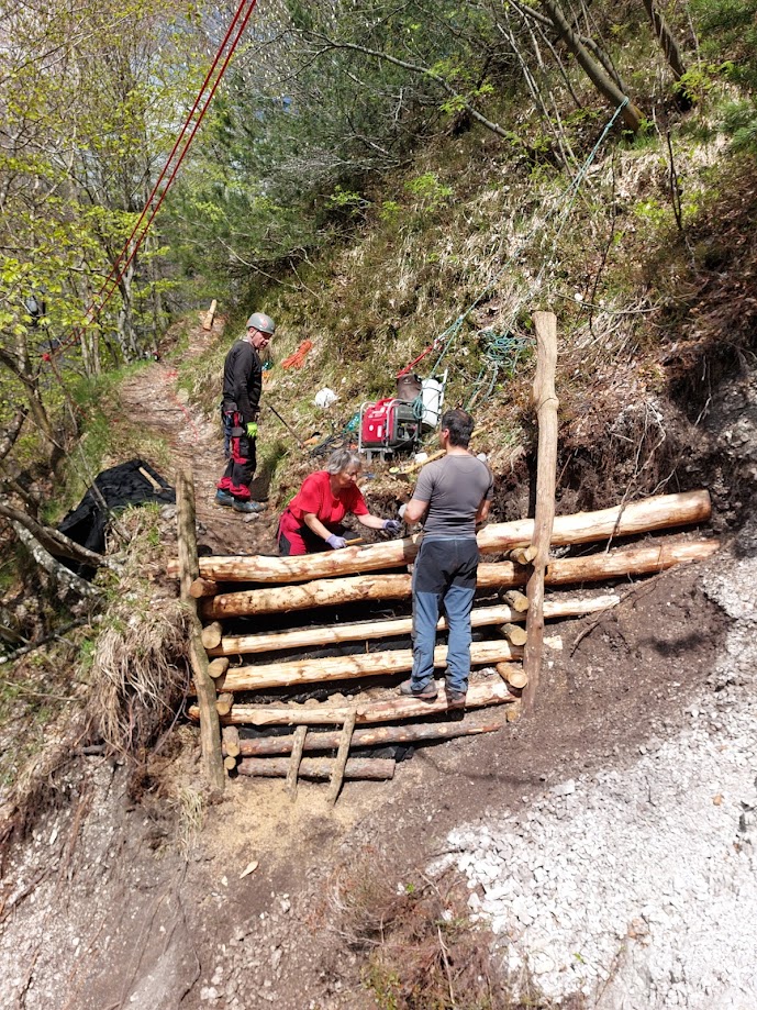 Naslednjo soboto pa je bilo treba ves teren pripraviti in les vgraditi. Kopanje, vrtanje, žaganje in pripenjanje na varovanje je delovalo skozi cel dan. Dolga debla so postala v strmini še daljša in težja, za vse je bilo treba uporabljati škripčevje. Nekateri so viseli na varovalnih vrveh večji del dneva. Vrtanje v razpokano skalo je sicer šlo malce lažje, a nikoli nisi vedel ali bo vse skupaj razpadlo in se odpeljalo v dolino ali pa bo skala obstala.