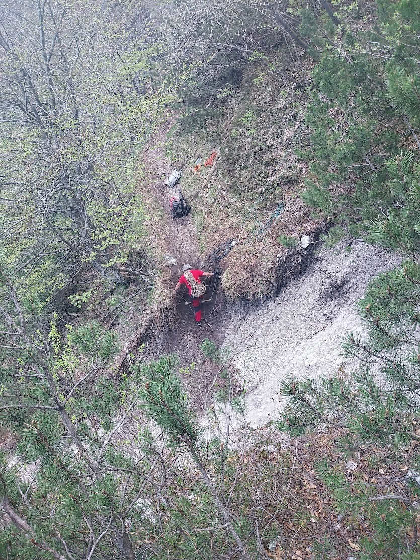 Spomnimo: med avgustovskimi poplavami leta 2023 je del planinske poti na Pasji peči preprosto odneslo. Nastala je precejšnja luknja, ki je bila tudi nevarna za prehod, saj je pod Pasjo pečjo kar lep prepad. Teren se je potem moral umiriti, kar je bil za markaciste čas, da se dobro razmisli, kako prehod sanirati. Idej je bilo seveda več, od mostov, klinov, prečnih debel pa do navadnih vrvi in nekaj stopnic. Na koncu smo se odločili, da mora biti prehod čim bolj varen in enostaven za vzdrževanje. Teren je namreč še vedno živ, zemlje pa dovolj, da nam pot zasuje še stokrat.