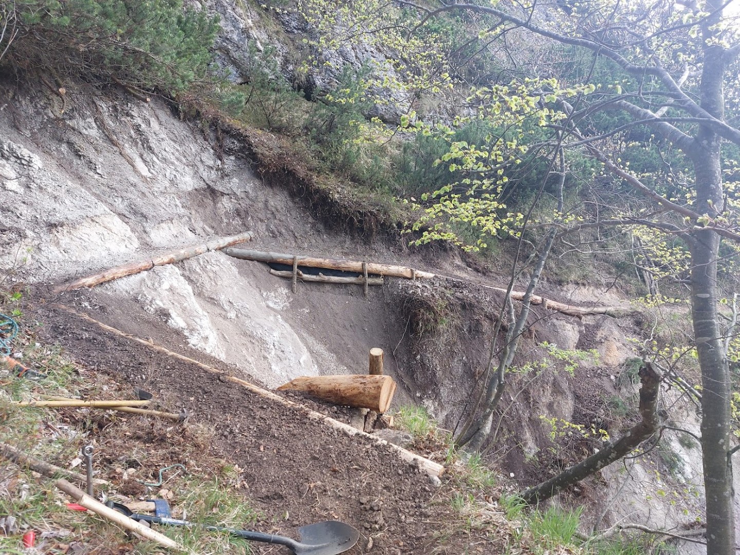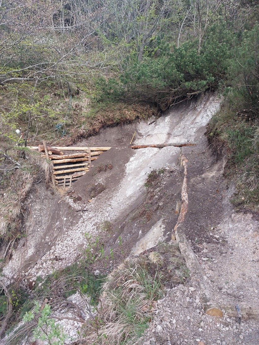 A markacijsko delo seveda ni nikoli končano, teren je vedno živ, vreme nam kroji usodo bolj, kot bi si želeli. Zato je bila potrebna še ena majhna akcija čiščenja prehoda, kjer smo odstranili plazečo se zemljino in pokosili celotno pot. In najbrž bo treba tako še nekajkrat, a tako pač je, tako je naše delo, nikoli se povsem ne zaključi.