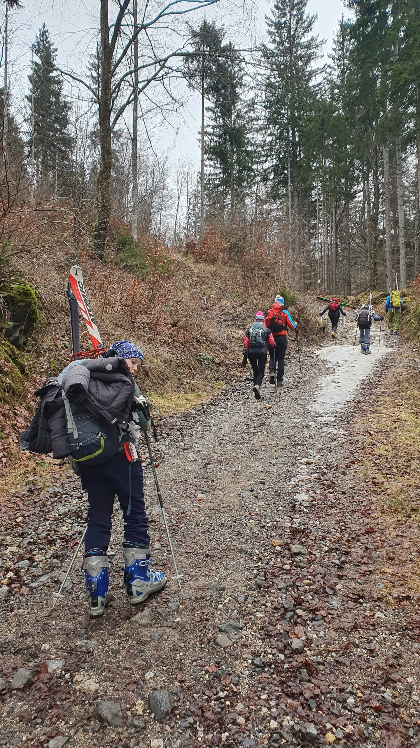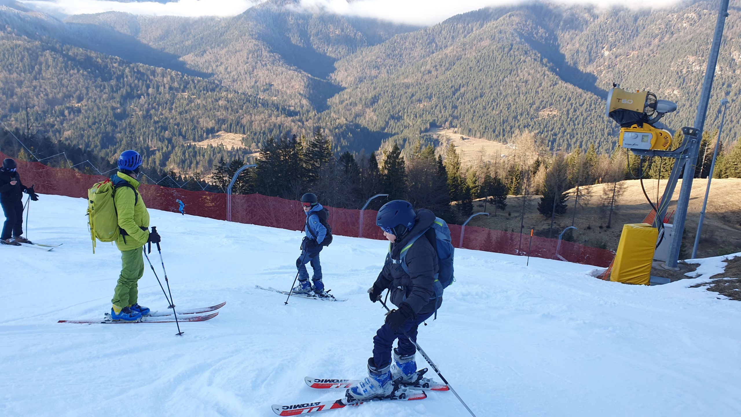 Spust s smučmi pa je bil bolj klavern. Umetni sneg in posledično led, popoldanska ura in kupi naritega snega, utrujenost nog… so nam še dodatno popestrili dan. Ampak mi se nismo dali. Soglasno smo se strinjali, da še vedno bolje slabo smučat v dolino, kot pa dobro sestopati v pancerjih. 🙂