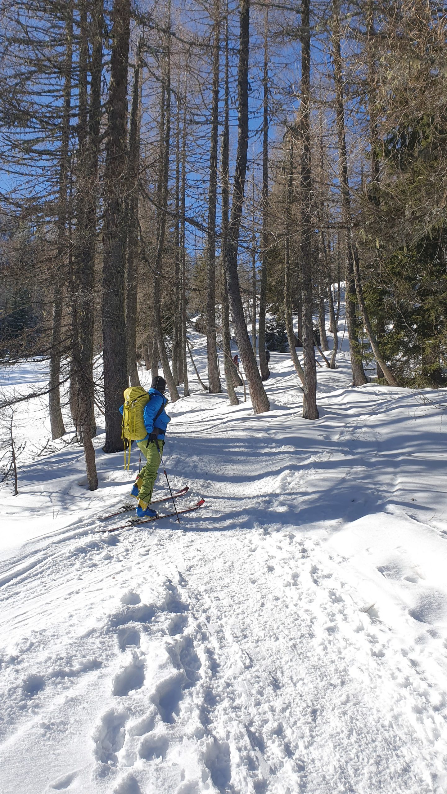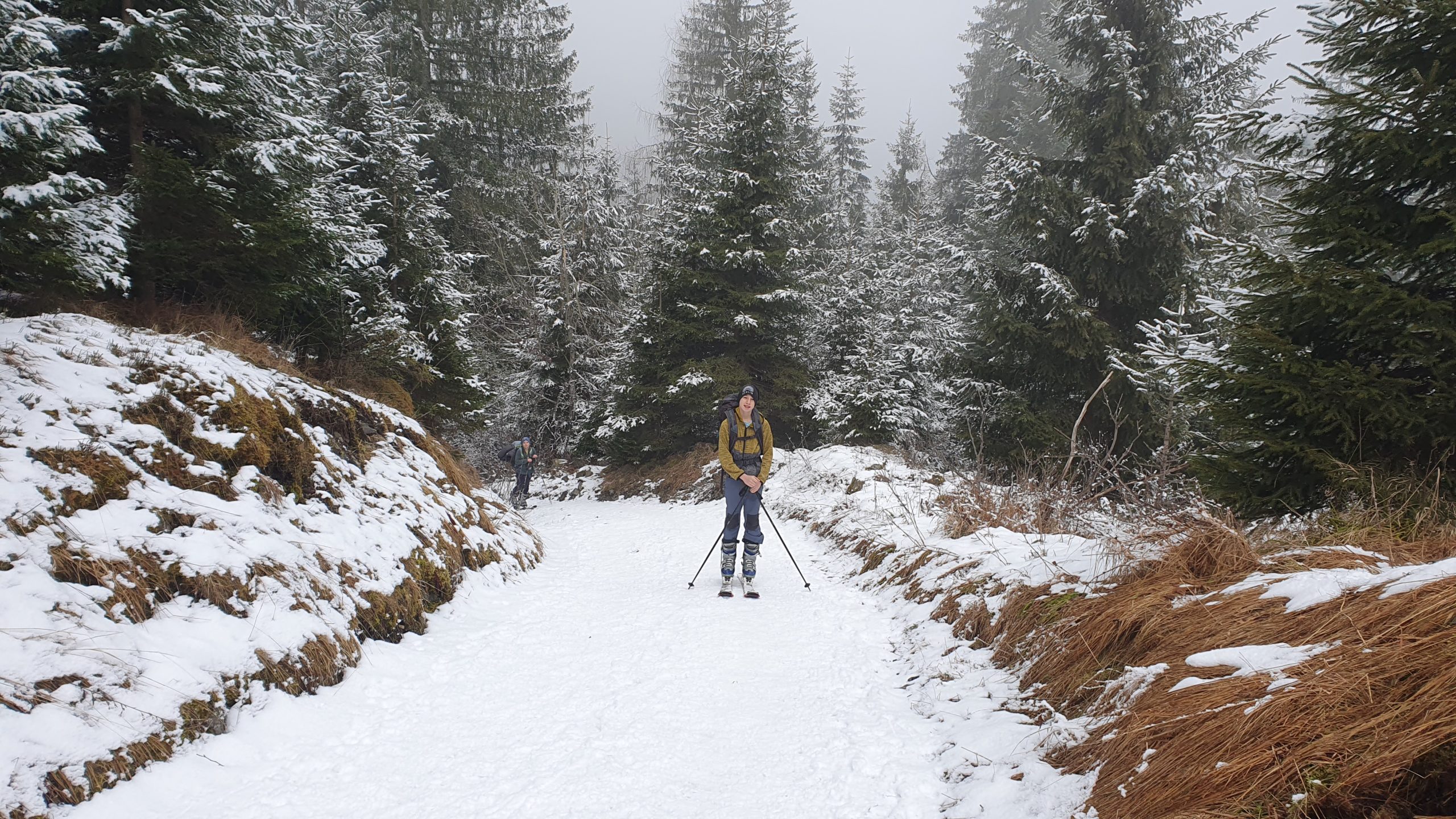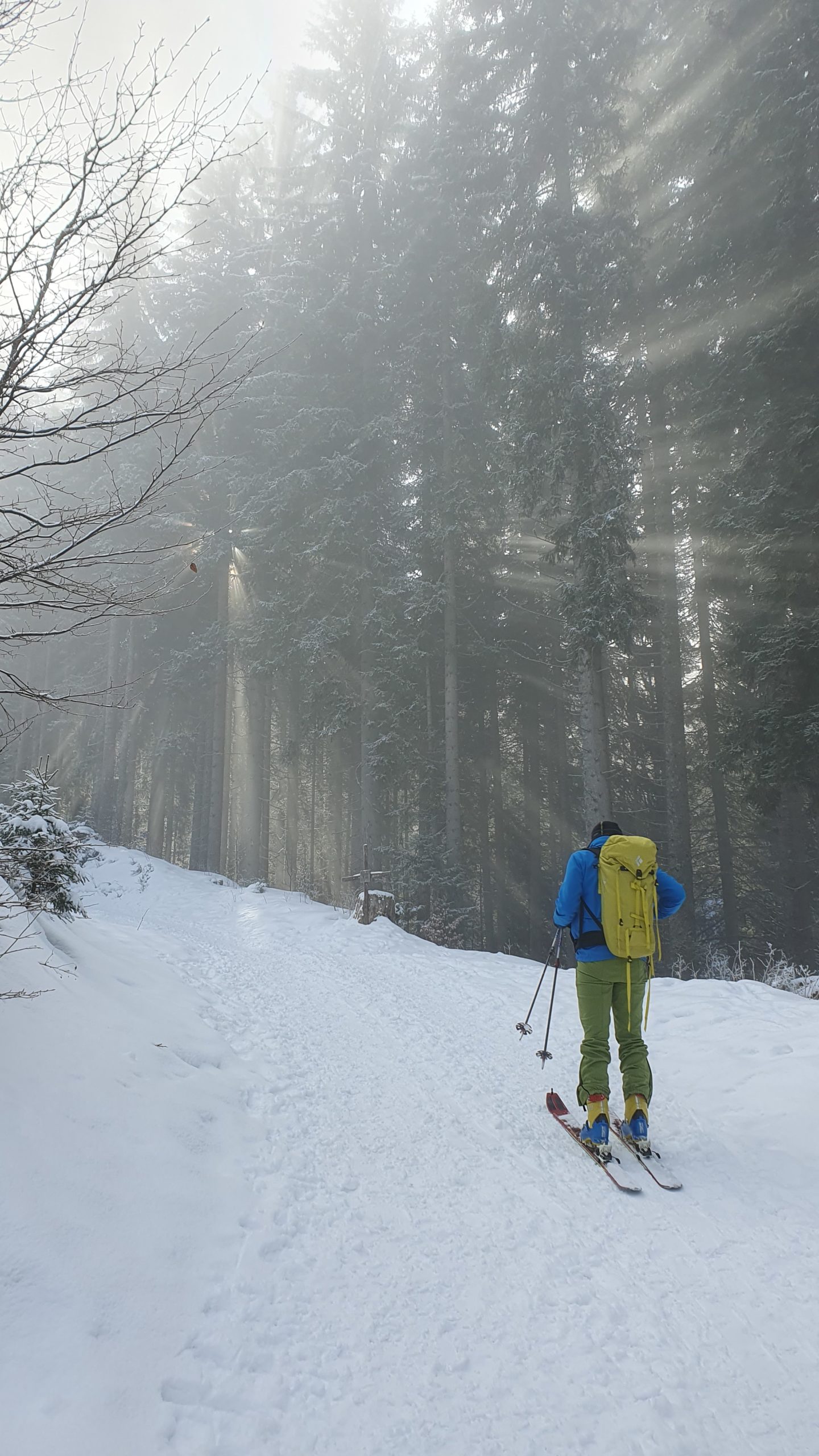 Letošnja zima pa je takšna, kakršna je… skromna, na žalost vsem ljubiteljem snega. Vseeno smo se odločili, da se povzpnemo na vrh, ker ni veliko destinacij v naši okolici, da se da prismučat v dolino do avta. Smo pa zadeli vsaj sončno vreme, da nas prvo uro nošnje smuči do začetka snega niti ni toliko motila. Že na začetku smo si rekli, da bo to dan za izkoristit. In smo ga, vzpenjali smo se zelo počasi po romarski peš poti proti vrhu. Veliko smo se ustavljali, blažili žulje, pili, občudovali okolico… proti vrhu pa nas je pričakala idila. Nekaj centimetrov svežega snega iz prejšnjega dne, sonce, razgledi in malica seveda.