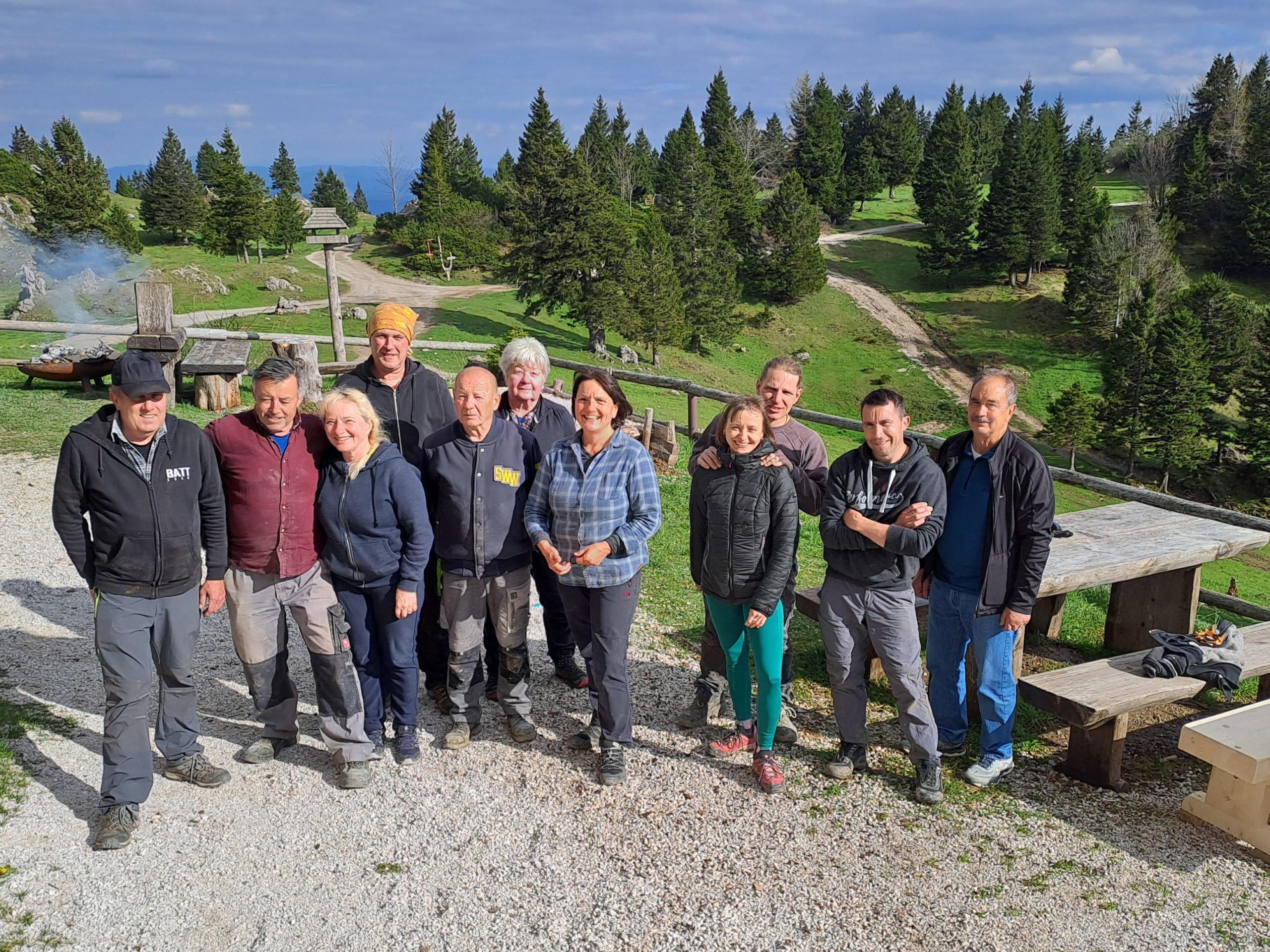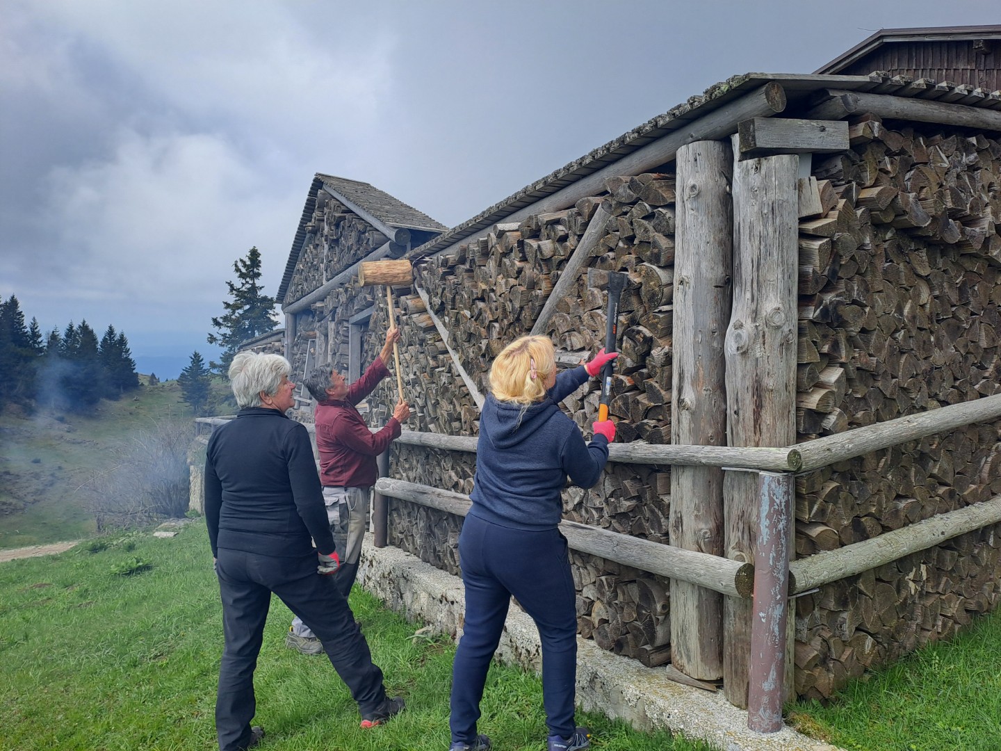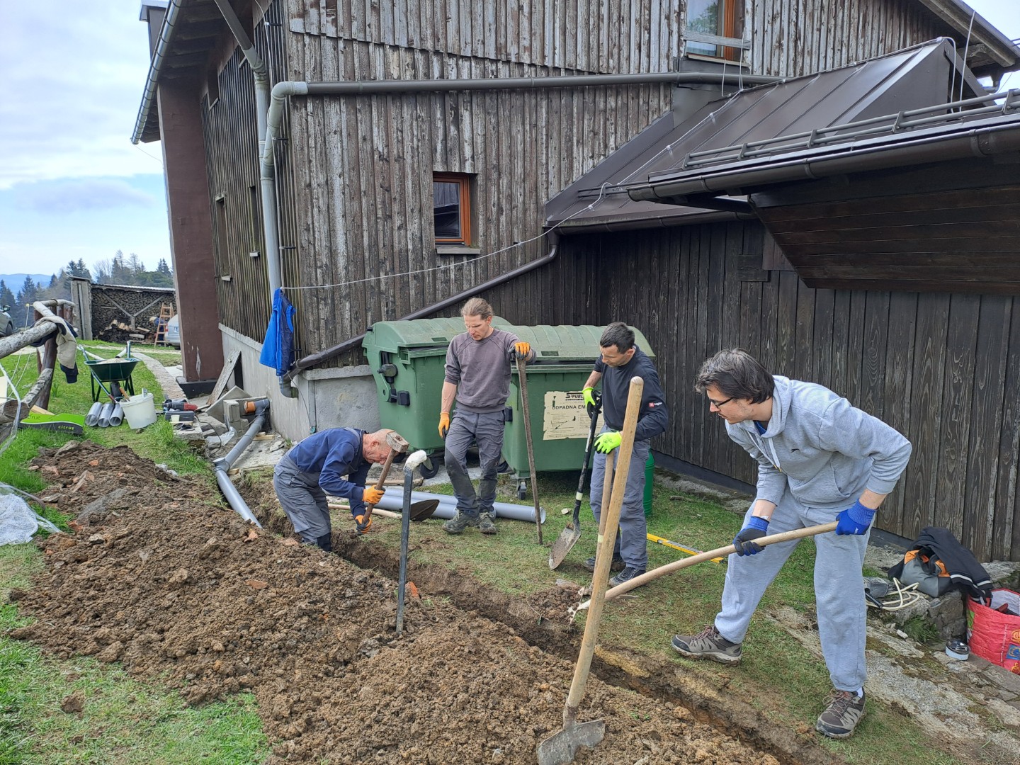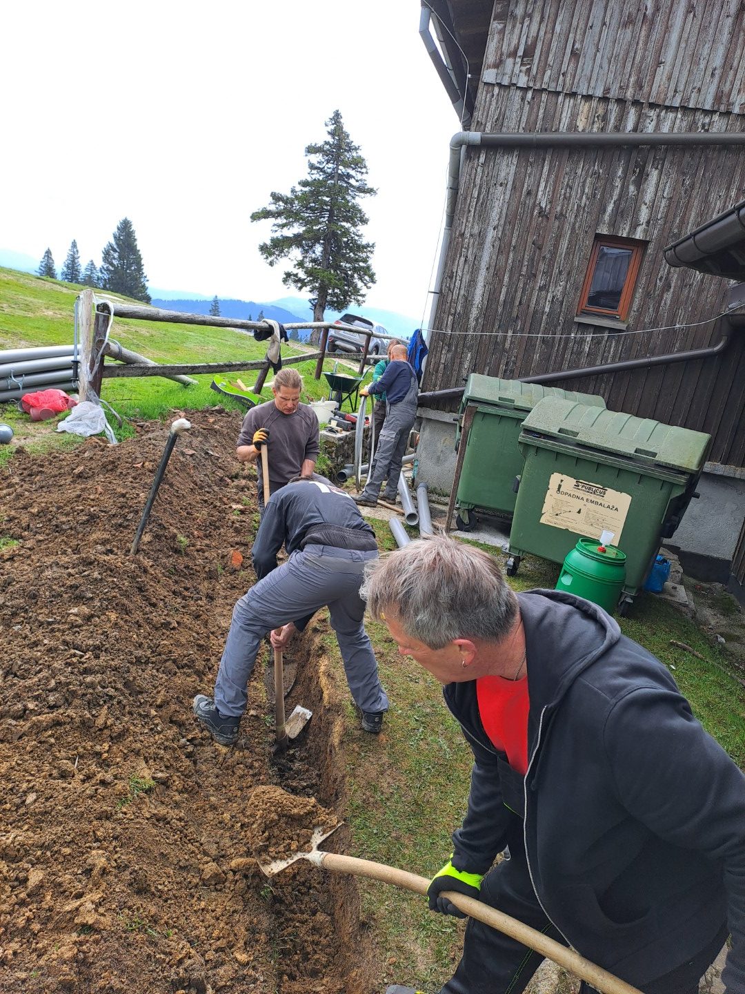 Tretja društvena akcija, 10. maja 2025, pa je lepo zaključila naša prizadevanja za oskrbo z vodo. Z zunanjimi cevmi smo namreč povezali oba rezervoarja za vodo. Vse viške vode iz manjšega zalogovnika v depandansi Doma smo preusmerili v glavni vodohran v Domu. Lahko rečemo, da se sedaj vsaka kaplja vode hrani. Izjemno smo veseli, da nam je tako obširno in pomembno akcijo uspelo izvesti s pomočjo prostovoljcev Planinskega društva Domžale.