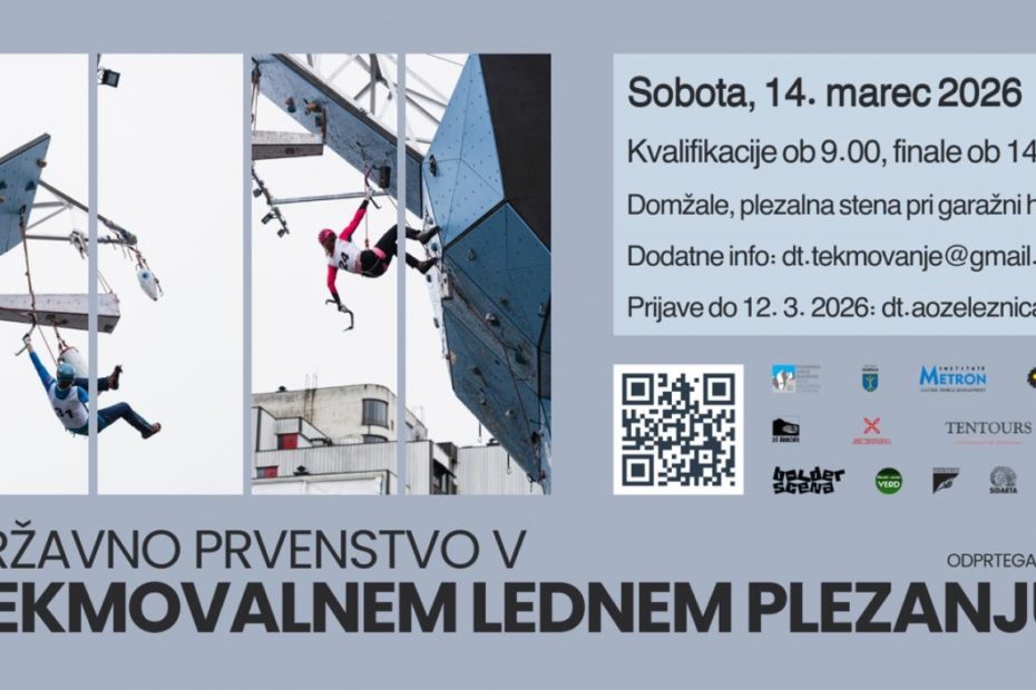 Vabljeni na državno prvenstvo v tekmovalnem lednem plezanju, ki bo v soboto, 14. marca 2026, pri garažni hiši v Domžalah, z začetkom kvalifikacij ob 10. uri in atraktivnim finalom ob 14.30. Pred domačim občinstvom bosta v pisani mednarodni konkurenci nastopila tudi najuspešnejša slovenska tekmovalna ledna plezalca Maja Šuštar Habjan in Gregor Šegel. Na prizorišču se poleg vrhunskega tekmovanja obeta dobro vzdušje. Vstopnine ni!